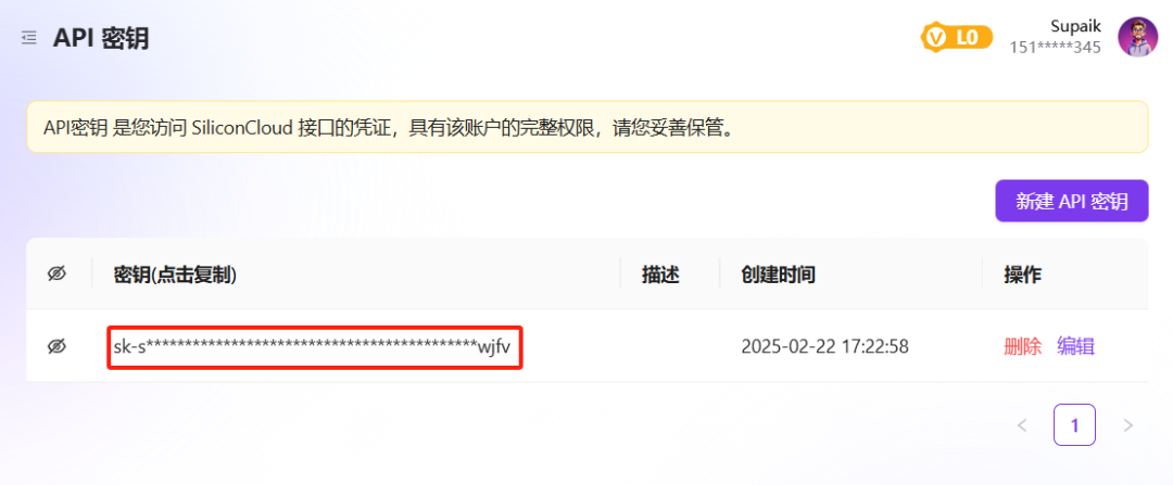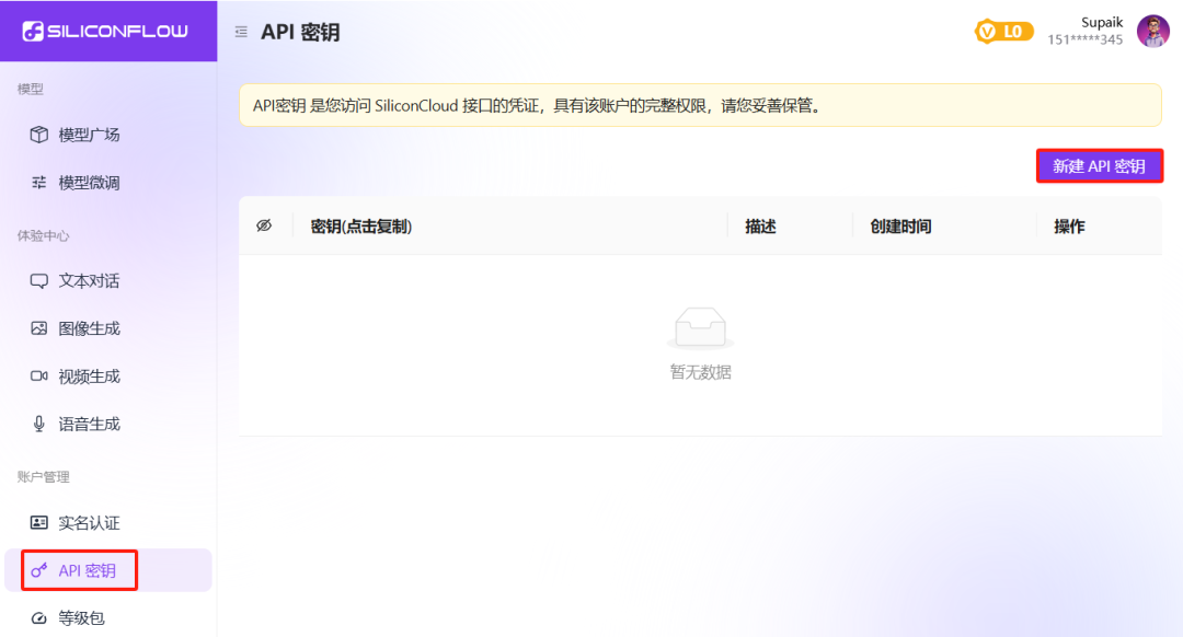 进入主页以后,在左侧的导航栏里面点击API密钥,点击新建API密钥生成API密钥。