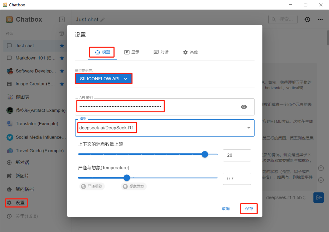 点击主页中设置选项,在模型提供方选择SILICONFLOW API,将之前在硅基流动中生成的API密钥粘贴进去,模型选择DeepSeek-R1模型。