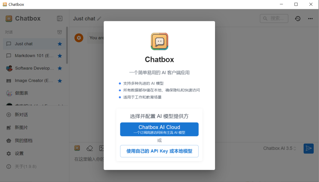Chatbox AI的安装程序我已经提前下载好了,点击链接保存下载,「Chatbox-1.9.8-Setup.exe」链接:https://pan.quark.cn/s/c52e910a12b9。