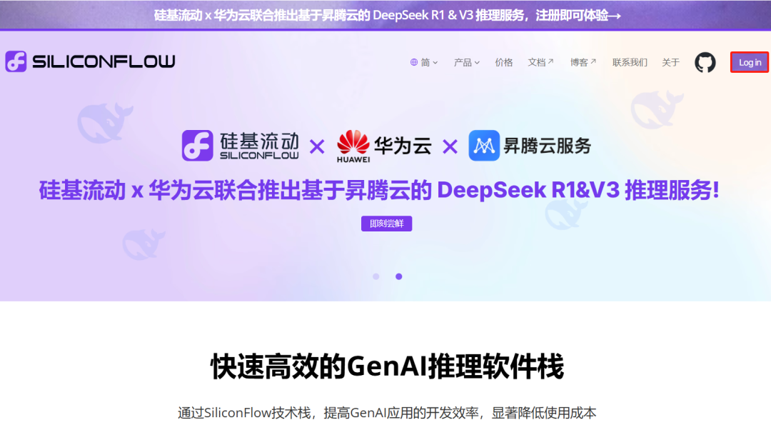 打开硅基流动的官网,官网地址如下,点击Log in注册账号。