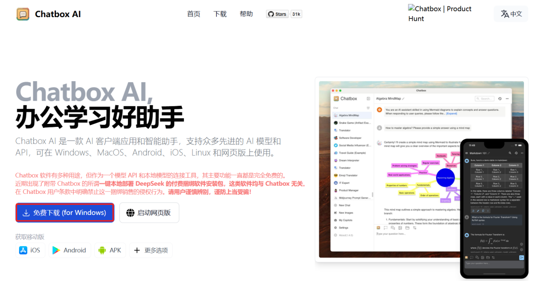 要安装Chatbox AI,可以打开如下的Chatbox AI官网,点击免费下载,下载好安装程序,https://chatboxai.app/zh
