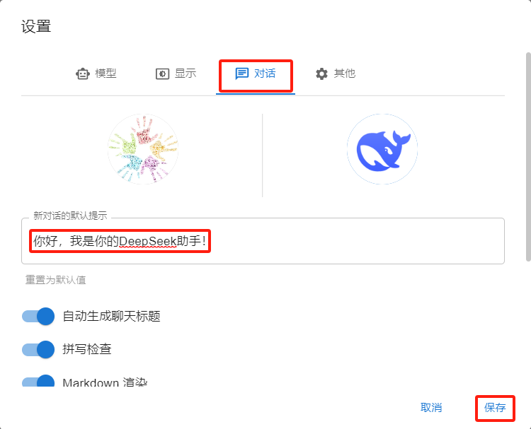 然后还可以对话选项中设置用户名的头像,以及新对话的默认提示,点击保存即可。