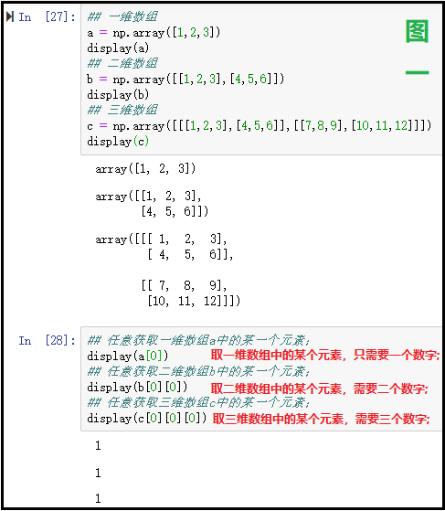 上图我们创建了不同维度的三个数组:a、b、c,主要关注下面In[28]那里的取数。