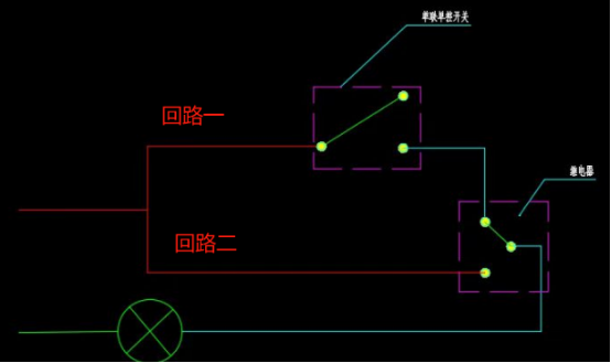 回路二在接通状态风扇的机械开关(单联单控开关)不能控制继电器的开关。