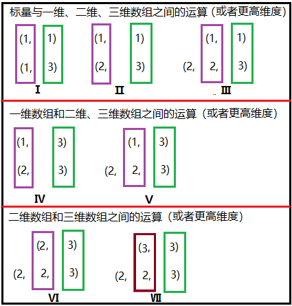 ① 要么对应位置上的数字完全一致,可以触发广播机制,比如说第Ⅵ组; -