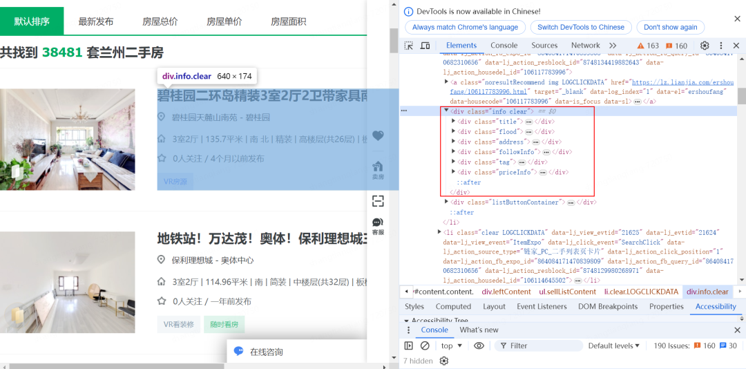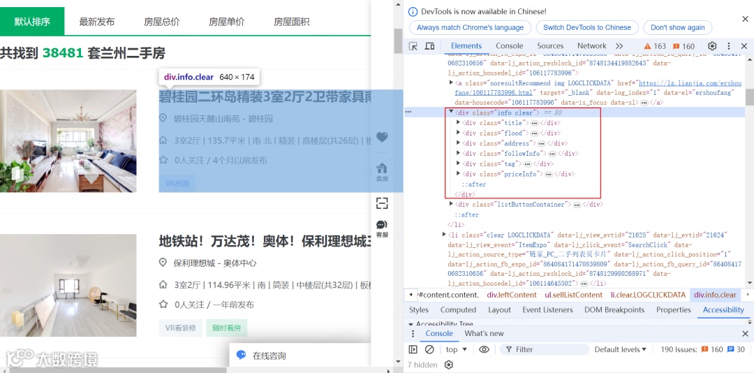 # 查找所有class为'info clear'的<div>标签info_divs = soup.find_all('div', class_='info clear')# 存储每套房子的信息的列表houses = []# 遍历每一个<div>标签for div in info_divs:# 省略了具体的解析代码,这部分代码从每个<div>标签中提取了房屋的相关信息,如标题、小区名称、地区板块等,并将它们存储到houses列表中。