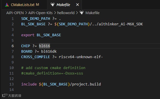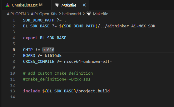 目前来说只需要修改第二行 BL_SDK_BASE ?= $(SDK_DEMO_PATH)/../aithinker_Ai-M6X_SDK 的编译路径设置即可。