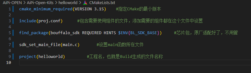 CMake 是一个跨平台、开源的构建系统,它可以帮助我们管理好工程里的软件架构。CMakeLists.txt 文件相当于执行的列表,它可以调用其他的.h 头文件和.so/.a 库文件,生成 Makefile,将.cpp/.c/.cc 文件编译成可执行文件或新的库文件。我们从简单的 helloworld 工程学习,先打开 CMakeLists.txt 查看里面的语句。