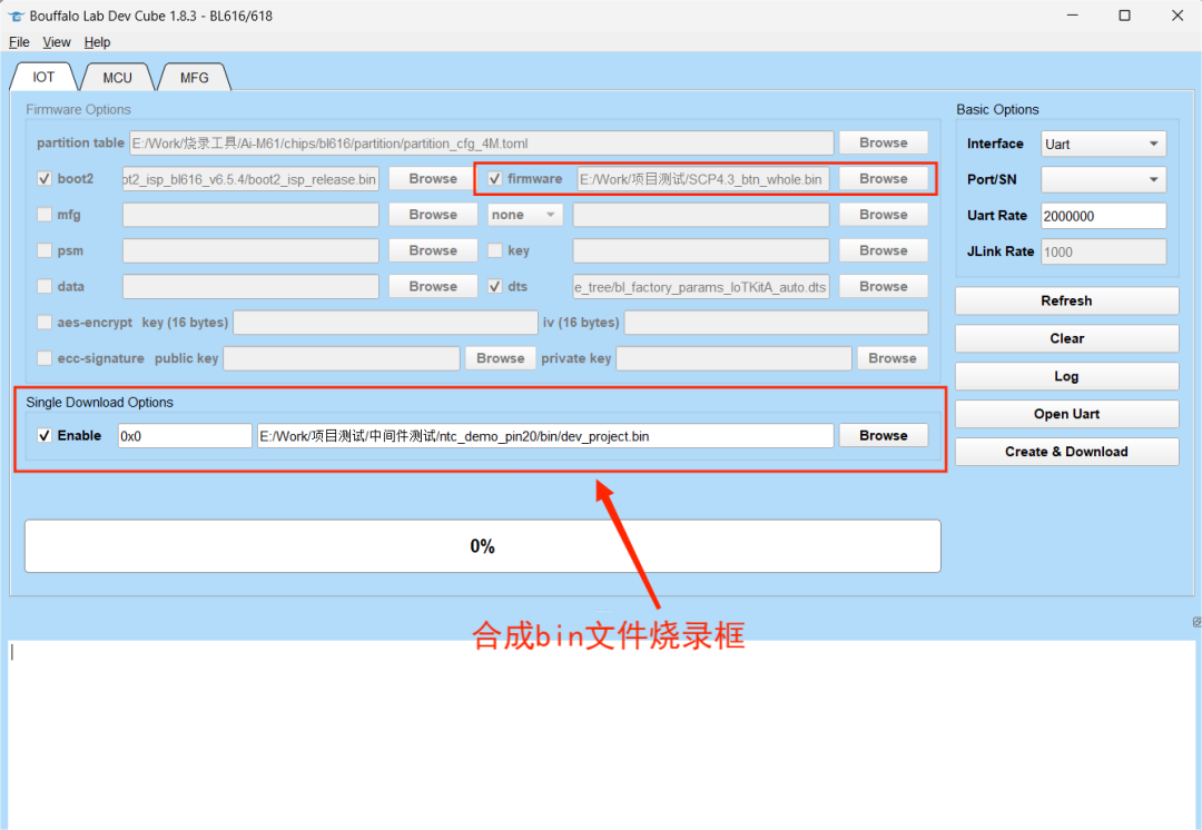 注意,这里的 bin 文件在博流的烧录工具上并不是合成的 bin 文件,这里对应的 bin 文件是图中的 firmware 目录下的 bin 文件,还需要其他的如 boot2 等文件,那么问题来了,使用 Single Download Options 烧录的合成 bin 文件在哪里,其实是在 SDK 中,具体的路径为: