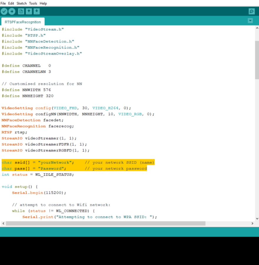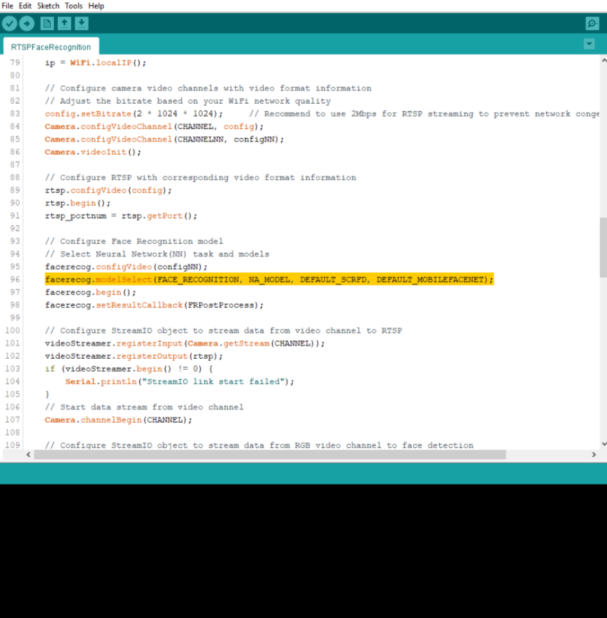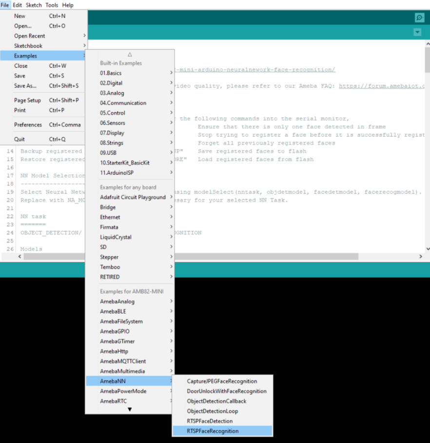 在 “文件” -> “示例” -> “AmebaNN” -> “RTSPFaceRecognition” 中打开人脸识别示例。
