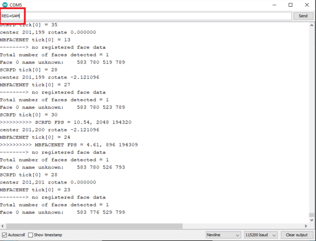 将相机对准人脸,然后在 Serial Monitor 中输入以下命令。