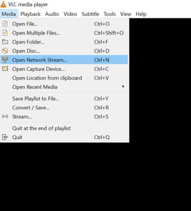 软件安装完成后,打开 VLC 媒体播放器,然后转到“媒体”->“打开网络流”。