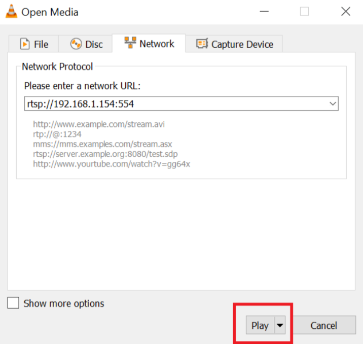 接下来,单击“播放”开始 RTSP 流式传输以查看结果。来自摄像机的视频流将显示在 VLC 媒体播放器中。