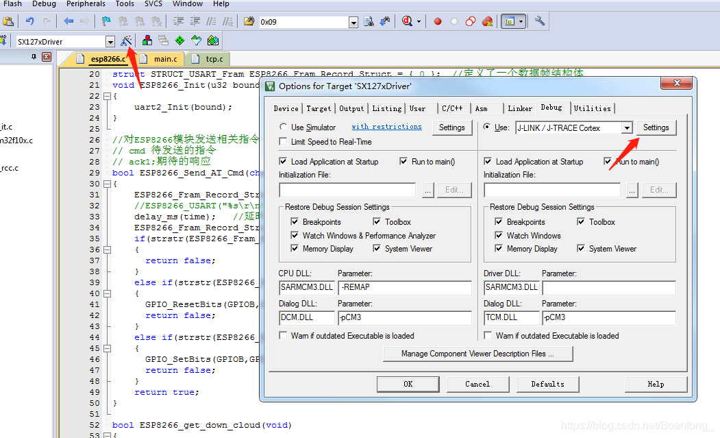线接好后打开我们提供的STM32代码程序,点击锤子图标选择Debug选项选择J-Link或者ST-Link下载程序。