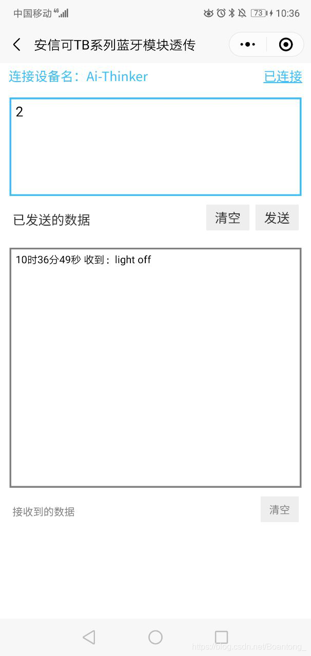 点击开发者工具导入之前下载的微信小程序源码,点击扫描二维码预览,使用微信扫码功能扫描下会弹出来相关的小程序界面,点击搜索蓝牙设备会弹出一个设备名称:Ai-Thinker的蓝牙设备,点击连接后会弹出一个发送和接收数据的界面,在发送区域填写1后点击发送,发送完成后会看到开发板上的灯亮起,接收区域收到light on,发送区域填写2后点击发送,发送完成后会看到开发板上的灯熄灭,接收区域收到light off。如下图