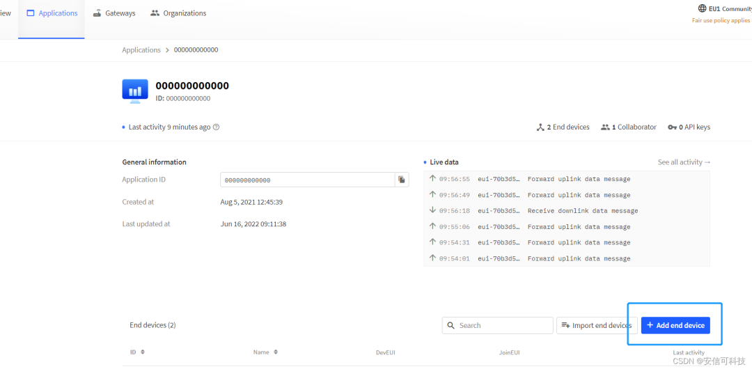 进入已经创建的应用页面点击Add end device开始添加节点设备,可以根据需求填入预设配置或是点击Generate自动生成新的Key。点击Register end device完成创建。