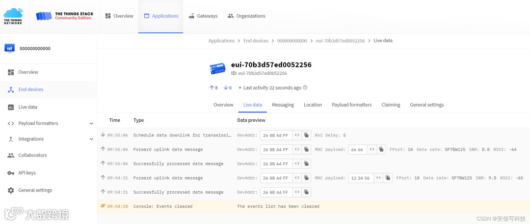 完成上述AT指令执行操作,若设备正常连接网关,在TTN管理页面我们能够看到设备的连接日志,以及上行的数据信息。