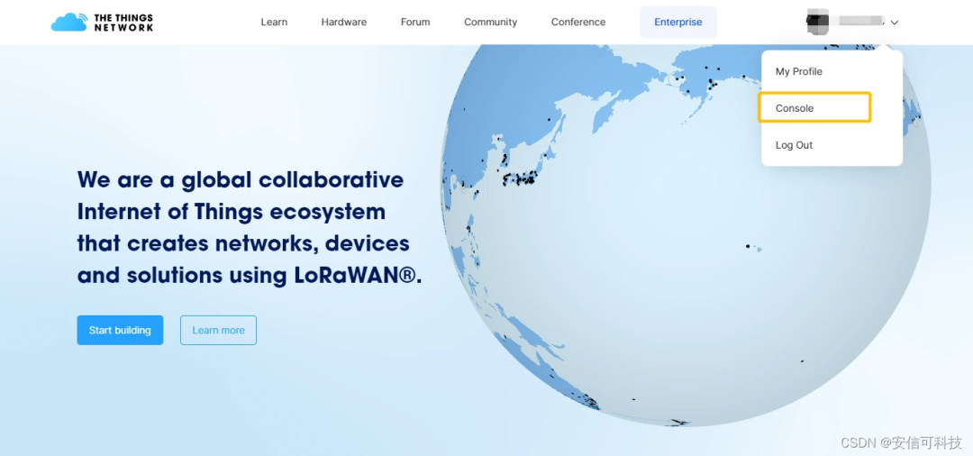 注: 该教程仅适用于TTN网关覆盖区域,未覆盖区域个人用户需要自建网关并将其连接至TTN服务器进行连接。