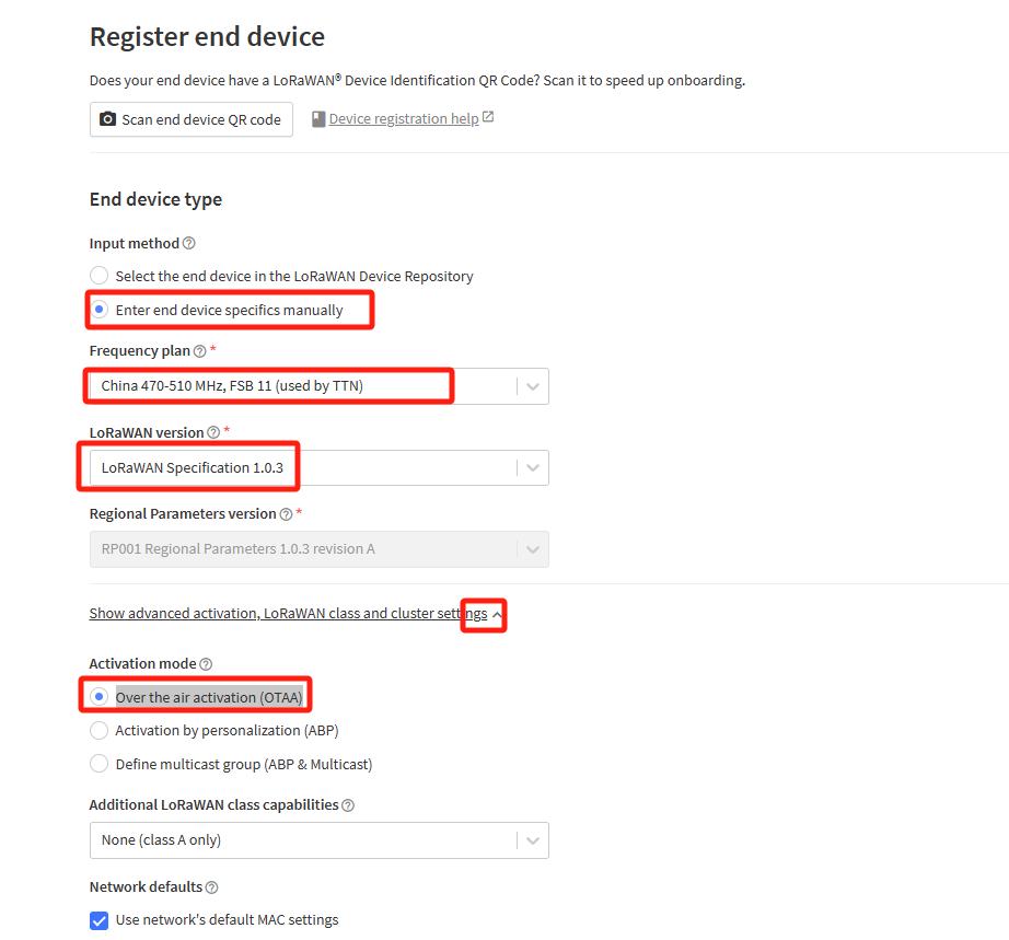 根据所在的地区及设备选择使用的频段,确保您使用的设备所使用的频段,与网关所使用的子频段选项匹配。LoRaWAN版本选择使用v1.0.3,区域参数使用RP001 Regional Parameters 1.0.3。
