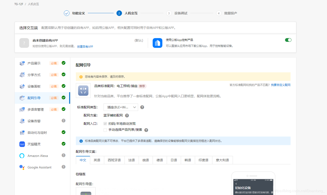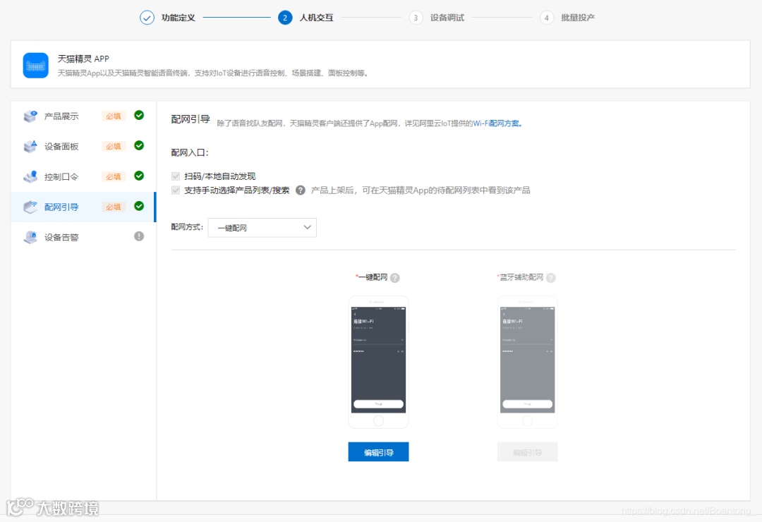 我们建立天猫精灵平台的产品首先选择一键配网的配网方式,其他设置与飞燕类似