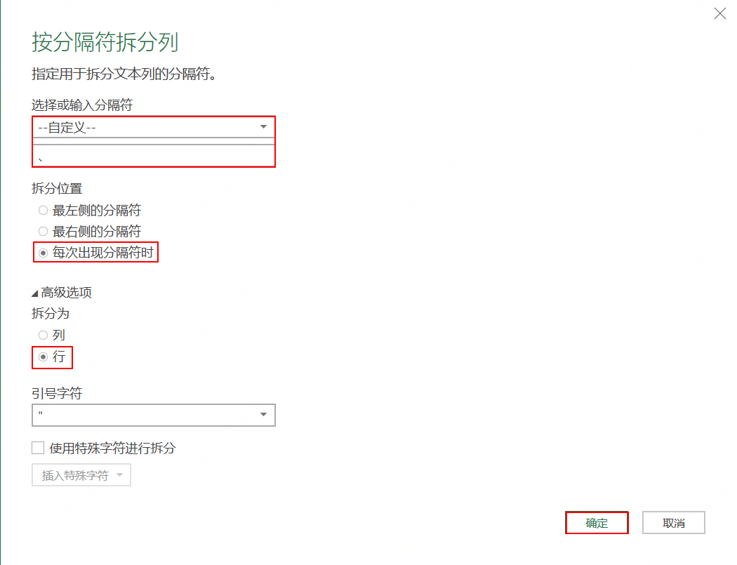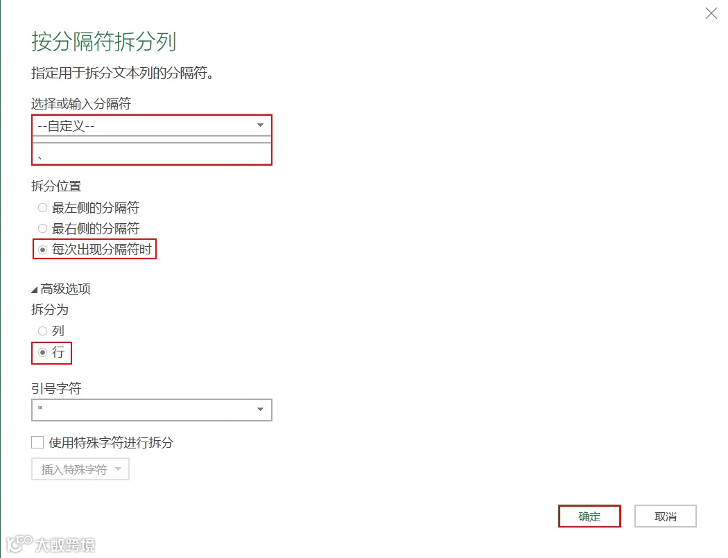 因为示例数据使用点分隔,所以选择自定义分隔符,拆分位置为每次出现分隔符时,拆分为行,点击确定。