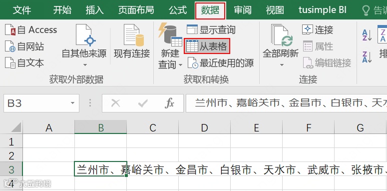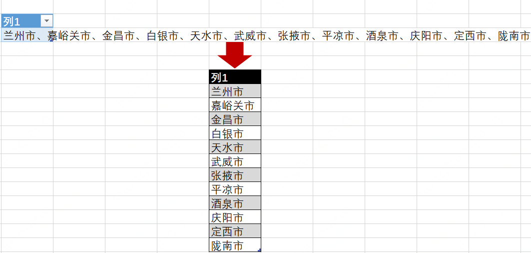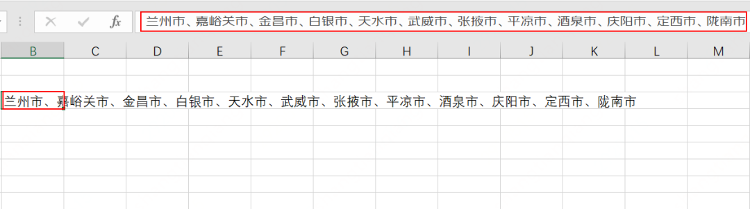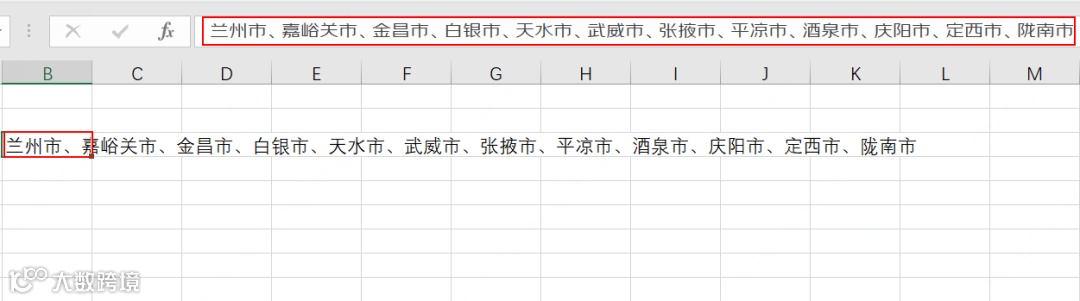 Excel将一行数据拆分为多行,如下有一行包含多个城市的数据。