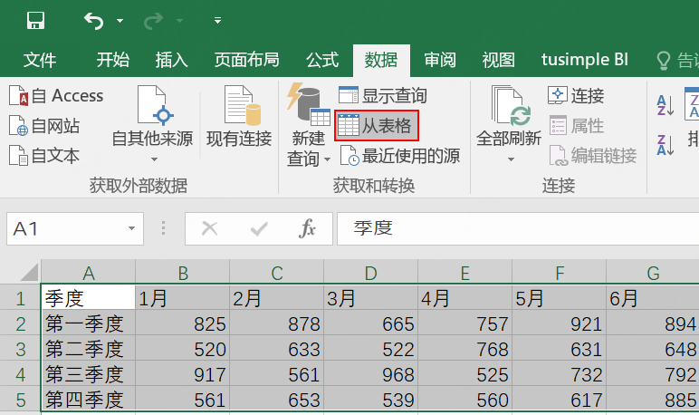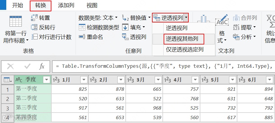 进入Powerquery界面,选择第一列数据,在转换选项卡下选择逆透视列中的逆透视其他列选项卡。