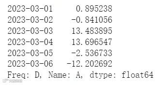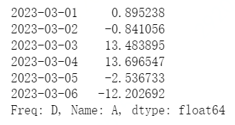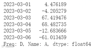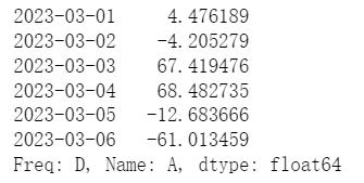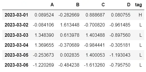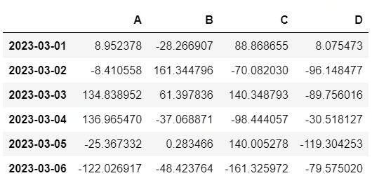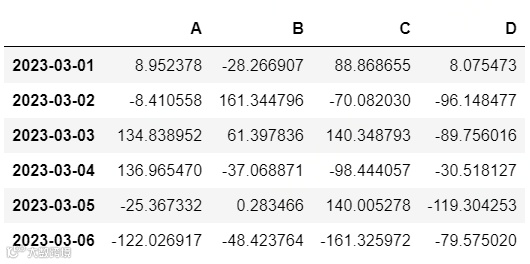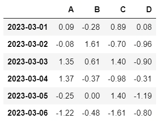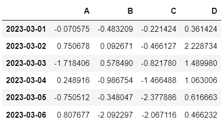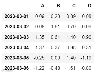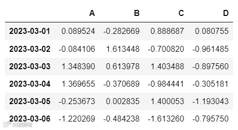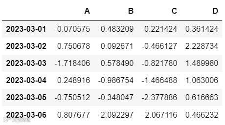 import pandas as pdimport numpy as npdates = pd.date_range('20230301', periods=6)df = pd.DataFrame(np.random.randn(6,4), index=dates, columns=list('ABCD'))df