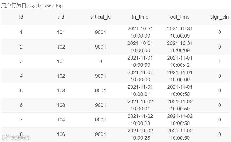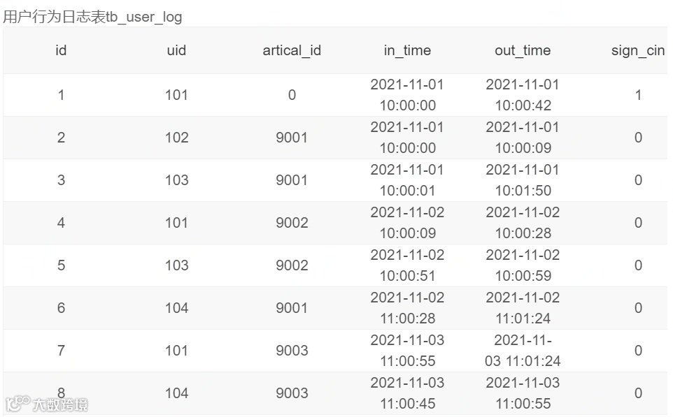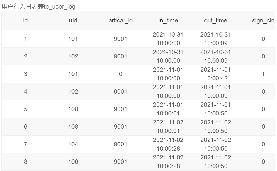 如下是用户行为日志表,求2021年11月每天新用户的次日留存率。