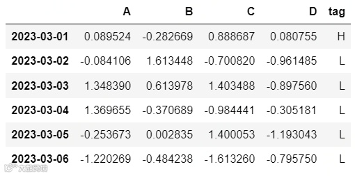 #增加一列数据df=df.assign(tag=(df['D']>0).map({True:'H',False:'L'}))df