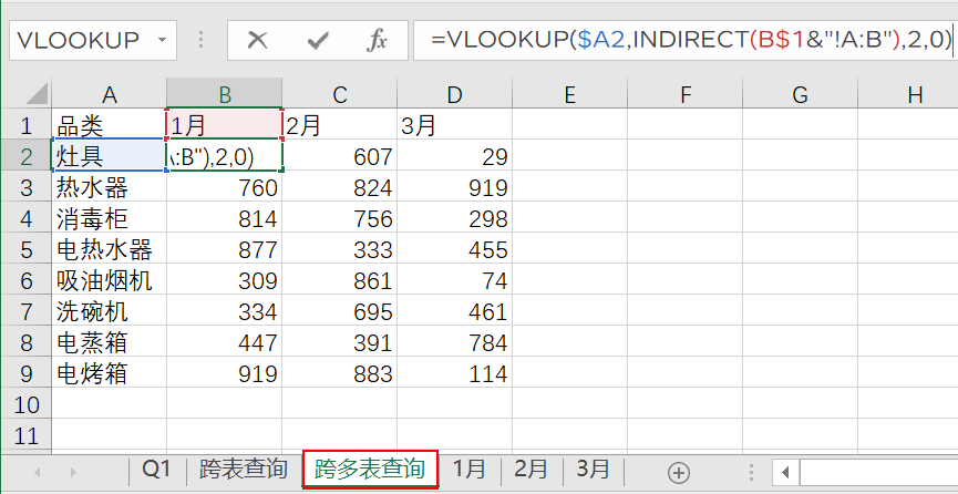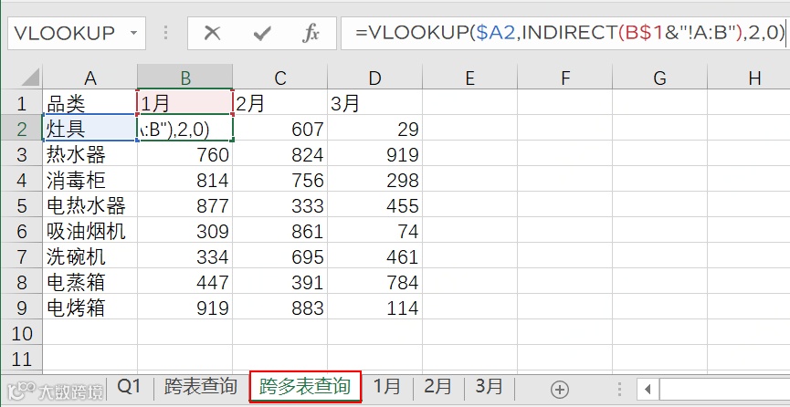=VLOOKUP($A2,INDIRECT(B$1&"!A:G"),MATCH("销量",INDIRECT(B$1&"!1:1"),0),0)