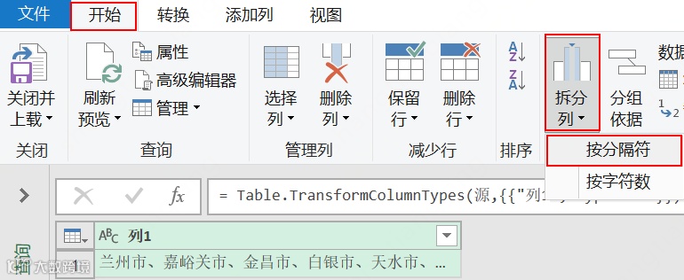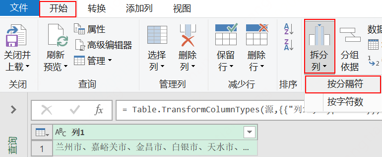 选择数据,在开始选项卡下点击拆分列按分隔符。