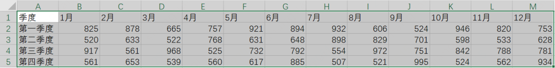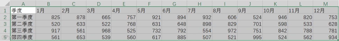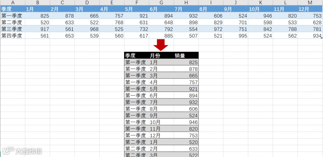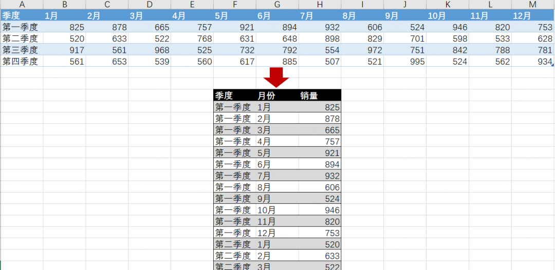 Excel将多行数据放到一列中,如下包含1月到12月共计12列数据,有5行数据,将以下多列数据聚合到一列中。