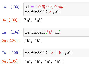还是前面的字符串s1,我们分别只想获取a、只想获取b、获取a或b,使用findall()会出现什么结果呢?