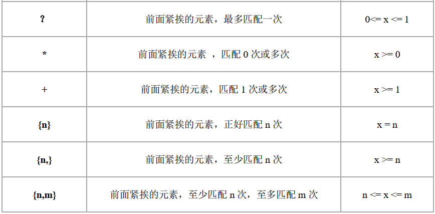 所为“量化符”,指的就是将紧挨着量化符前面的那个字符,匹配0次、1次或者多次,详细说明见下表。