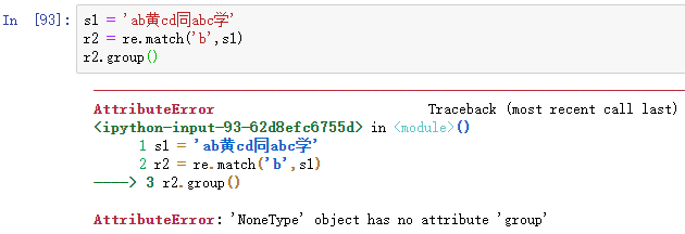 此时可以发现:报错了。这是由于match()函数只能从字符串开头匹配,如果开头没有匹配上,则会报错。因为字符串s1是以a开头,不是以b开头,所以匹配不上。