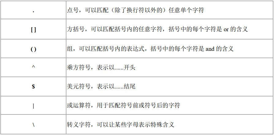 正则表达式之所以这么强大,是因为拥有很多专用的操作符(又称“元字符”)、特殊字符和修饰符。