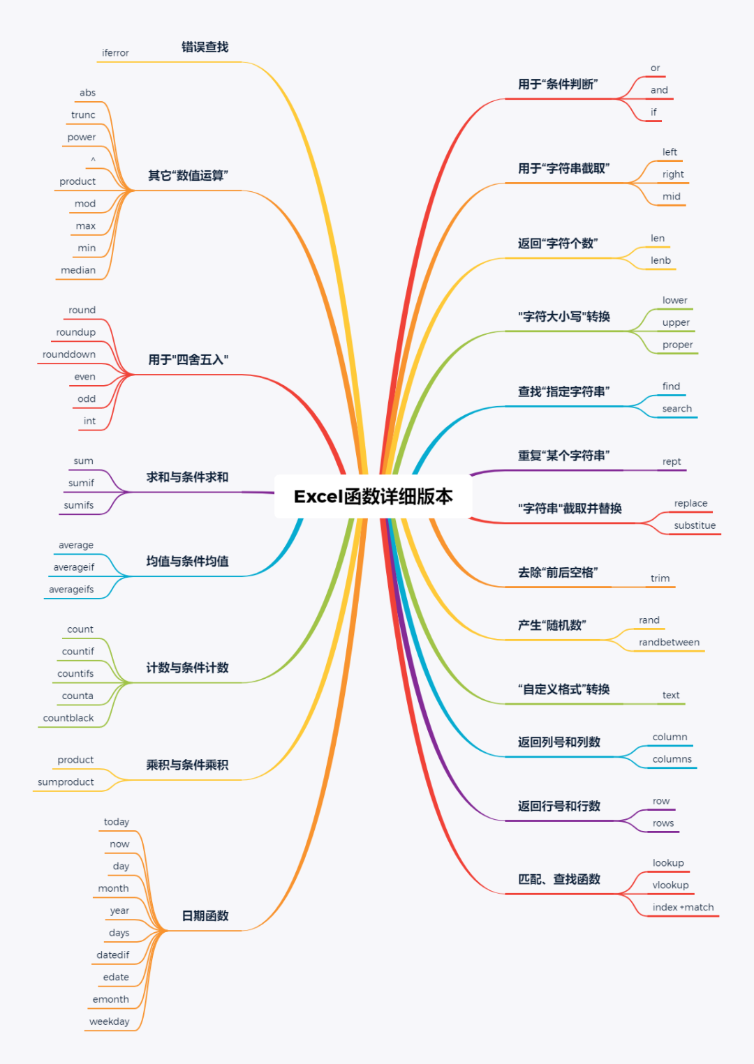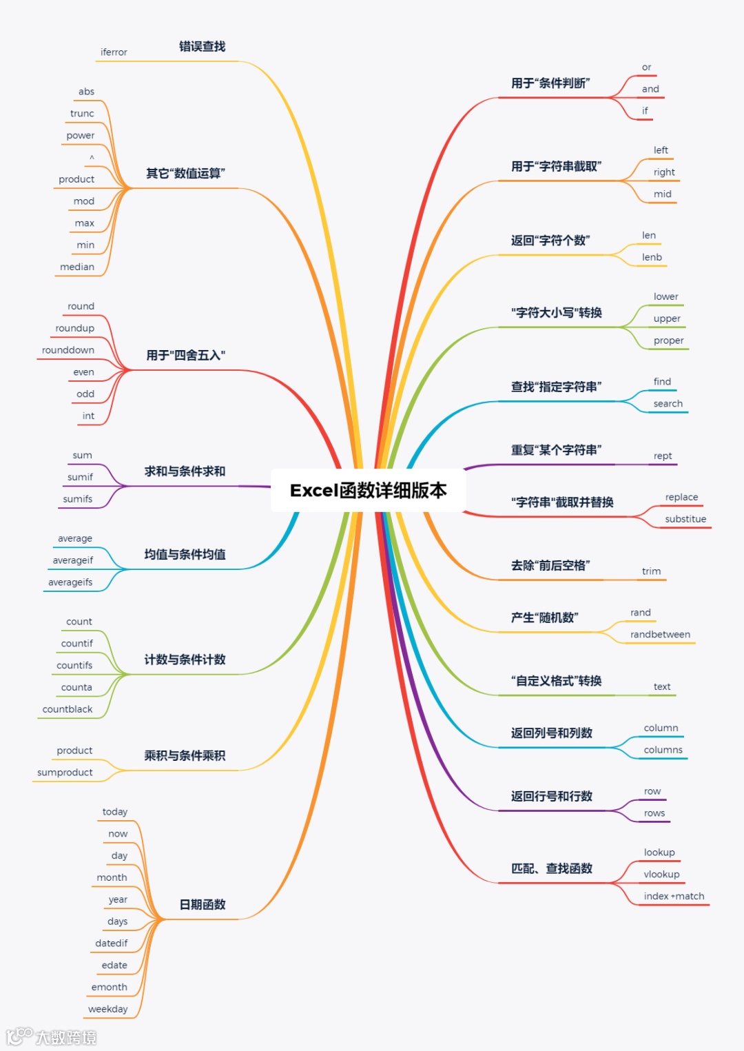周末,抽空给大家做了一张Excel思维导图。这里详细给大家列出了作为一名 “数据分析者” 需要用到的Excel函数,不过这里只是列出了各种函数,并没有给出含义。