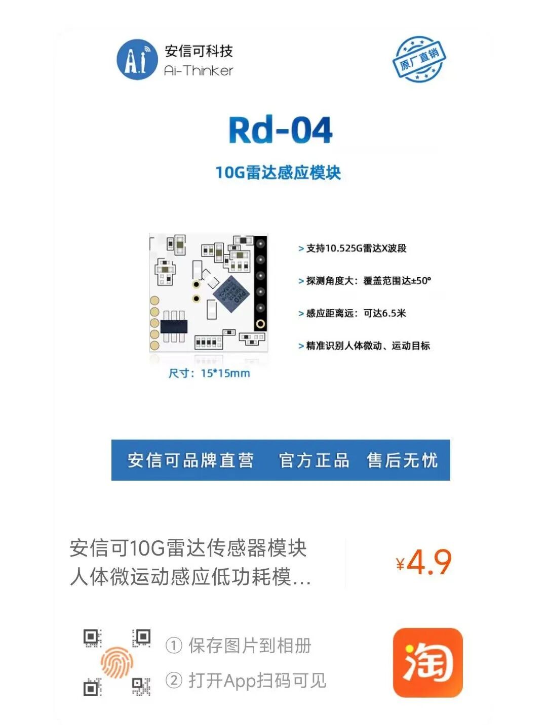 Rd-04中心频率为10.525GHz。其主要功能是感应人体的微动、运动,挂壁状态下雷达探测的最远距离为6.5米,雷达探测的覆盖范围可达±50 度;这款模组具备低成本、低功耗的优点,高性能的同时还能帮助节能降本。