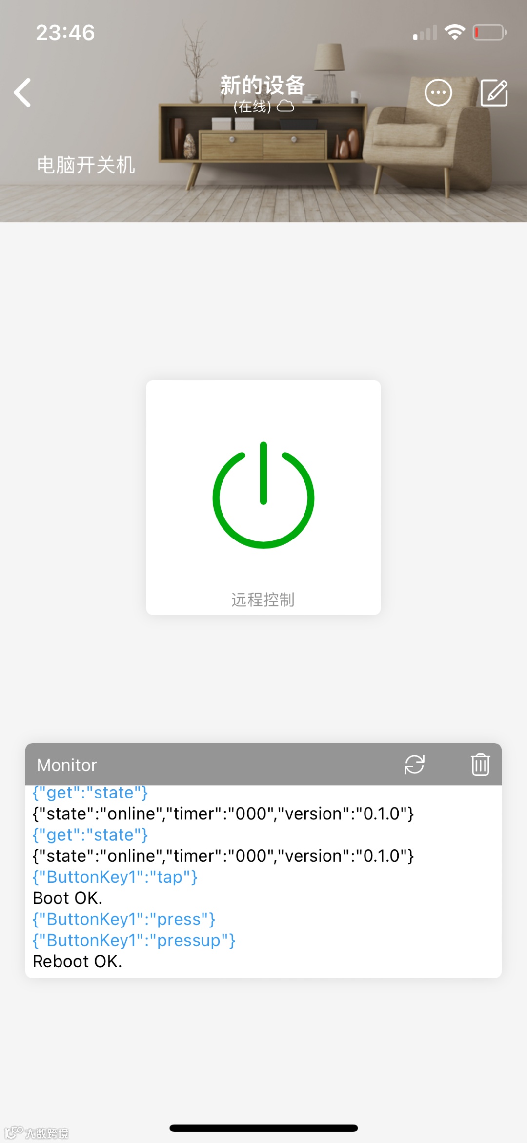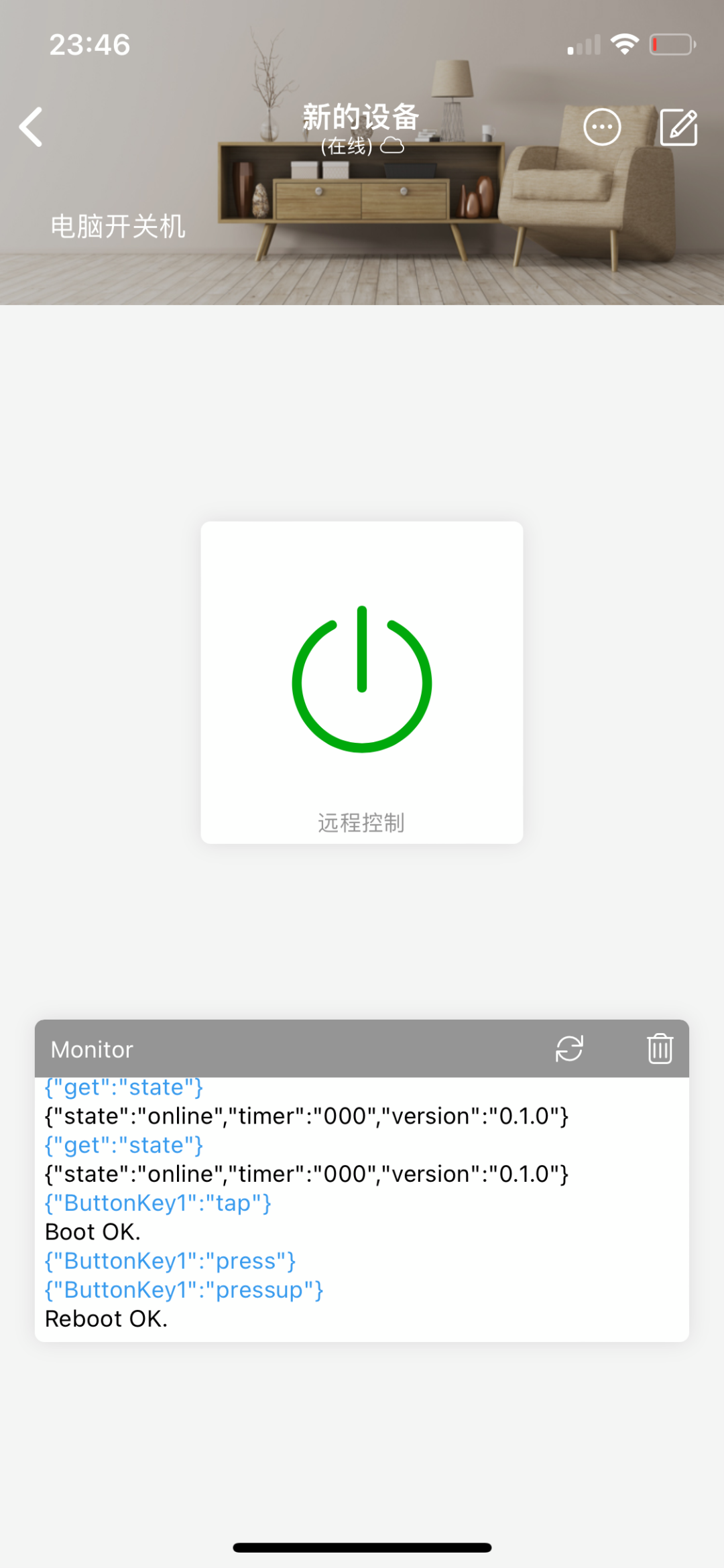 3、 手机端使用Blinker App,自定义控制界面;开机从和重启复用一个按钮,单机是开机,长按重启。