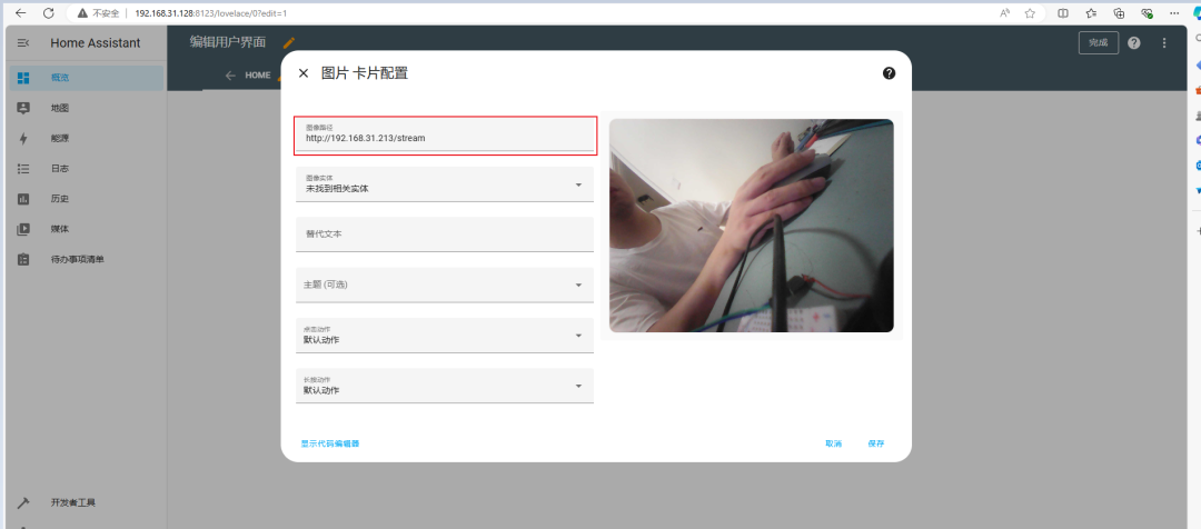 搭建完成后就可以把摄像头接入到 HA 了。在接入前,鼠鼠还思考着是不是需要修改固件代码,让设备推流到 HA 上接入。但是当我打开 HA 的界面的时候发现一个有意思的卡片。