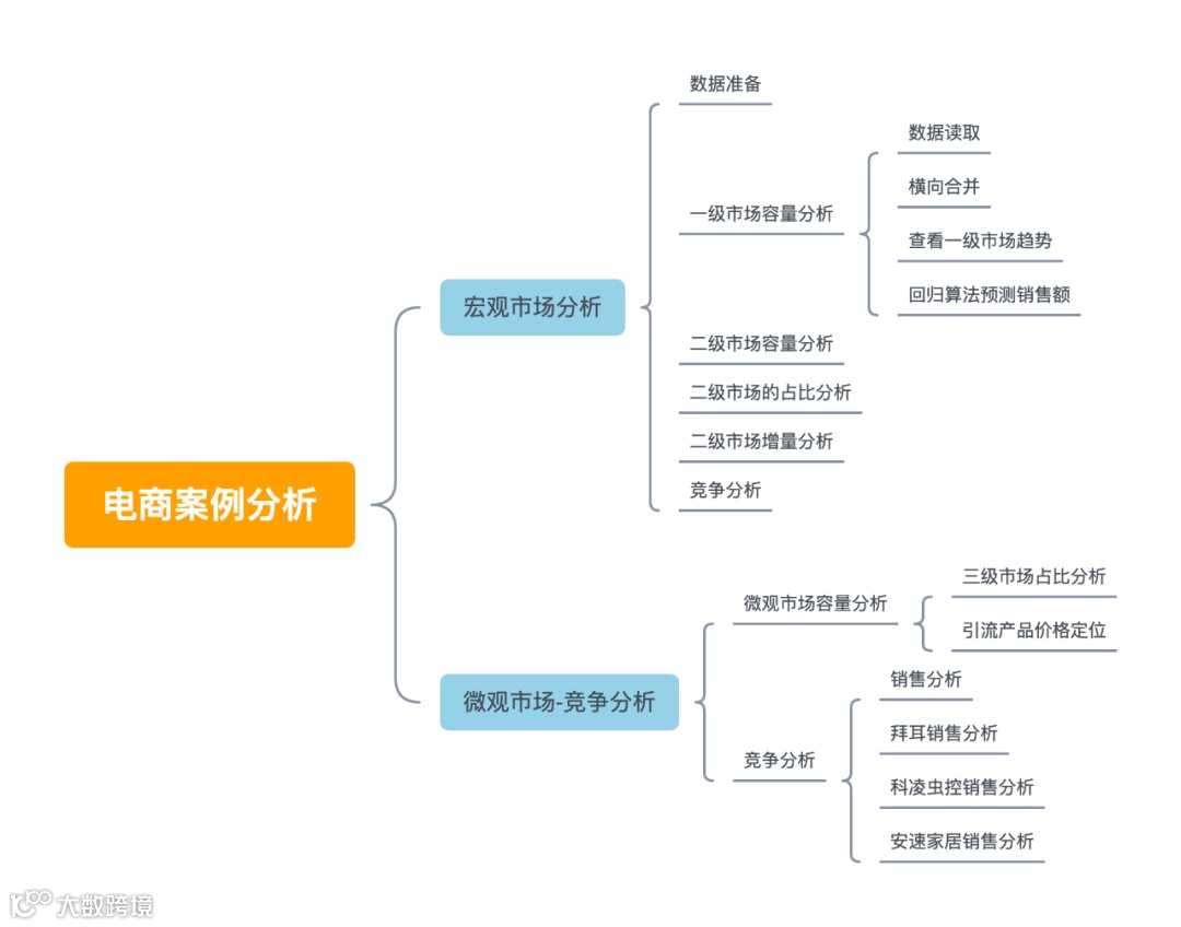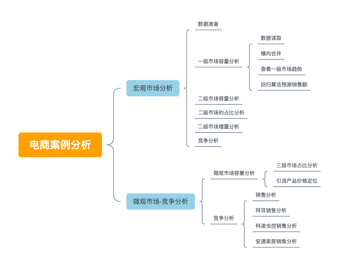 到目前为止,本次案例算是完成了分析任务的一般。从刚开始介绍了一些简单的电商案例分析基础知识,并从宏观市场及微观市场分析几家电商的销售数据。其中微观市场分析并未结束,将在接下来的下篇中分享给到大家。其主要内容包括如下: