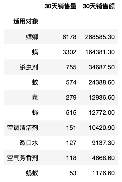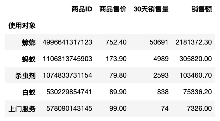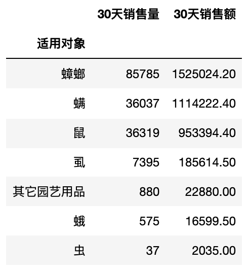 为了查看拜耳产品分不同使用对象的总销售额,对使用对象聚合并所有字段求和,其中主要看30天销售量和销售额两个字段即可。其余两个字段聚合求和得到的结果并没有意义。