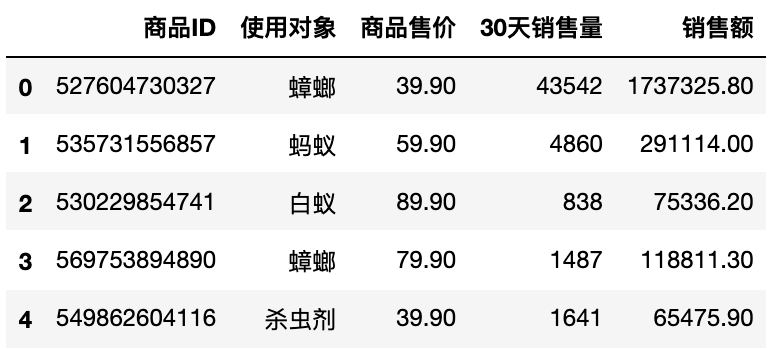 baier = 拜耳[["商品ID",'使用对象',"商品售价","30天销售量","销售额"]]