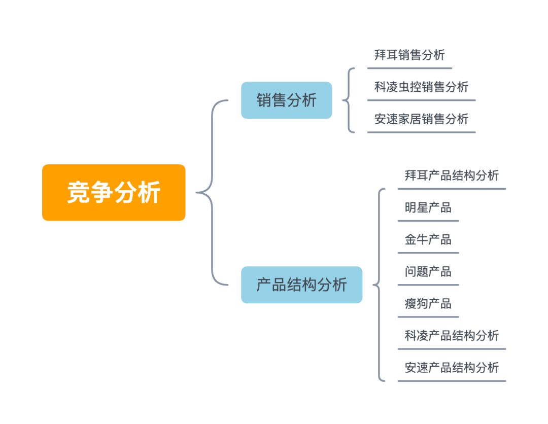 本次竞争分析将从两个方面着手,一是销售竞争分析,其中包括拜耳、科凌虫控和安速家居销售分析。二是产品结构分析,这一部分将在本次案例分析下篇中继续展开,本篇不涉及。