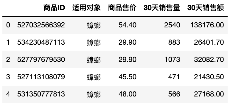 keling = 科凌虫控[["商品ID",'适用对象',"商品售价","30天销售量","30天销售额"]]
