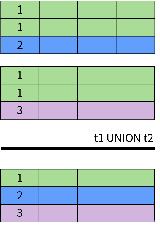 SQL 中的关系概念来自数学中的集合理论,因此 UNION、INTERSECT 和 EXCEPT 分别来自集合论中的并集(∪)、交集(∩)和差集(setminus)运算。