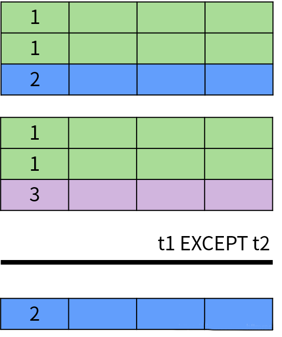 EXCEPT 或者 MINUS 操作符用于返回两个集合的差集,即出现在第一个查询结果中,但不在第二个查询结果中的记录,并且排除了结果中的重复数据。