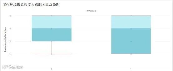 如图,就中位数而言, 离职人员对工作的满意度相对较低为2.5,从中位数与第一四分位的差值来看,普遍离职人员对于工作满意度较低,离职人员中有对工作满意度为1的员工。