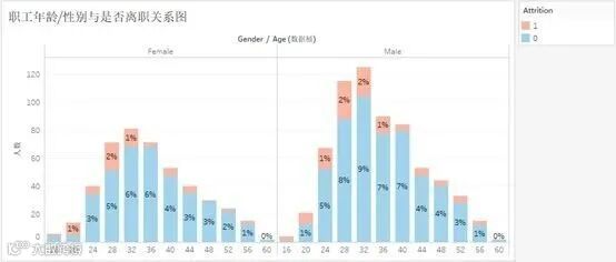由下图可以看出,离职人员偏年轻化,峰值出现在28-32岁,其中男性离职人数大于女性人数。